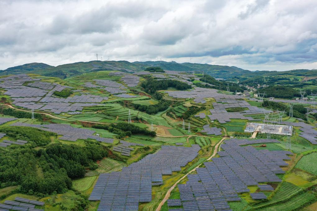 6月24日,貴州省威寧縣雙龍鎮高山村的仙水窩農業光伏電站,滿山蔚藍的光伏板錯落有致。
