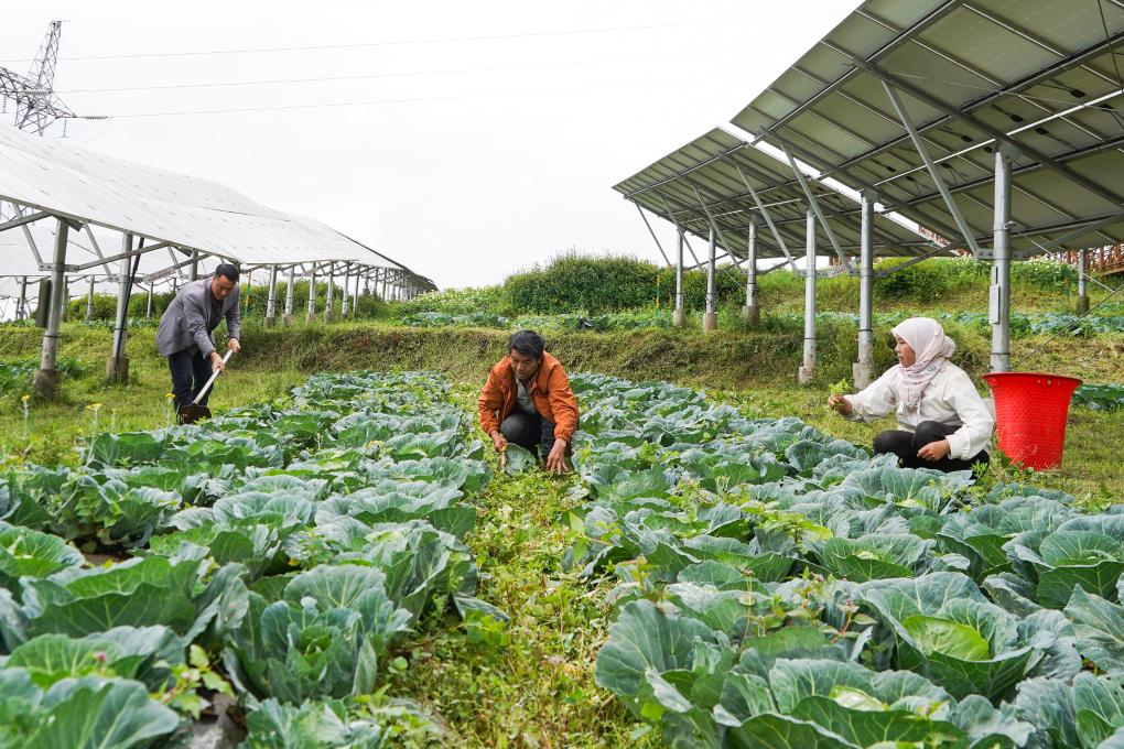 6月24日,貴州省威寧縣雙龍鎮高山村的仙水窩農業光伏電站,務工群眾在對光伏板下的蔬菜進行管護。