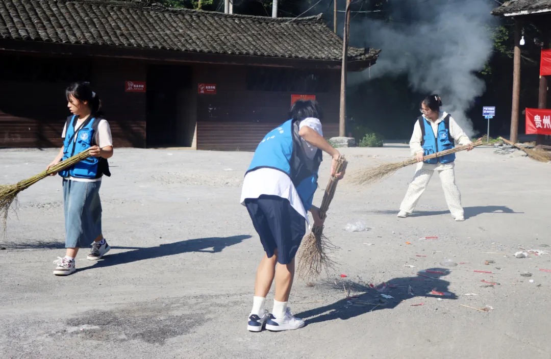 在大灣苗寨廣場,實踐隊員們積極投身環境衞生治理工作。他們不怕臟、不怕累,手持掃帚、垃圾袋等工具,認真清理村莊道路和公共區域的垃圾,用實際行動為改善鄉村環境貢獻力量。
