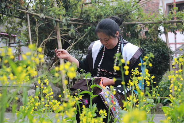 菱角村的苗族婦女幾乎人人都會織布、蠟染、刺繡,她們以針當筆,用線為墨,專注地繡着精美的圖案;或以銅刀蘸蠟,用布作畫,將心中勾勒的美好畫面一一呈現。
