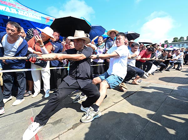 7月30日,松桃苗族自治縣長興堡鎮,人們在參加拔河比賽。