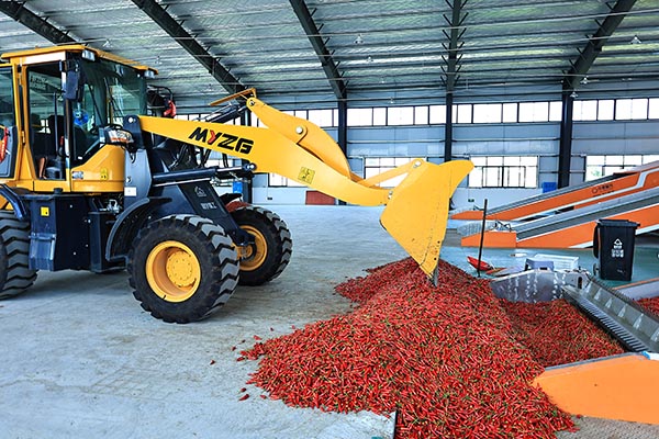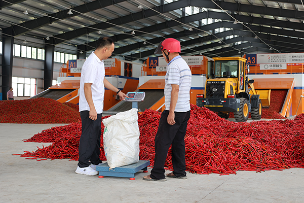 松桃自治縣通過“公司+村集體+農戶”的模式,由縣強村富民公司面向全縣發展“訂單”辣椒,實現種有定向,産有指向,銷有方向。目前進入采收期,在縣強村富民公司的辣椒加工工坊裏,工作人員正在忙着幫助種植戶進行辣椒卸貨、過磅、開具收貨票據。在這裡,每天可分揀、烘乾1000斤鮮辣椒。