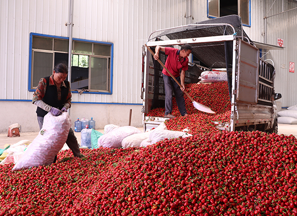 當辣椒迎來豐收季,當地加工廠也被這份喜悅“點燃”,變得熱鬧起來。在徐源辣椒有限公司的加工廠內,剛從田間運來的鮮辣椒被送上了自動化生産線,經過烘乾,最終變成了一袋袋香氣撲鼻的幹辣椒。
