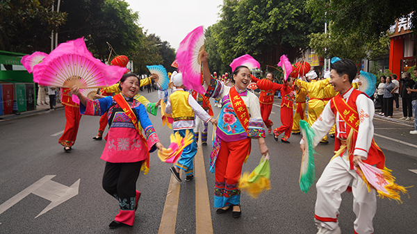 活動尾聲,隨着《歌唱祖國》的旋律響起,全場千人共舞,彩扇翻飛如霞,燈籠搖曳似火,將國慶的喜慶氛圍推向高潮。