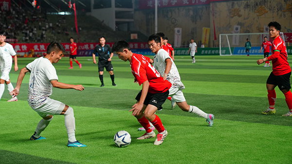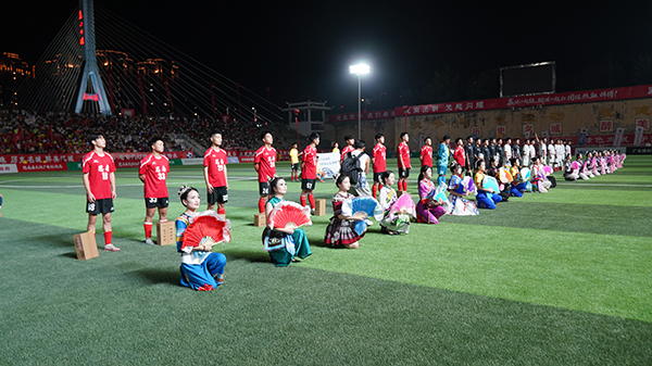 “銅‘足’仁義·梵凈爭鋒”。19:30分,隨着裁判一聲哨響,本場核心賽事——思南陳薯花燈隊與沿河烏江畫廊隊的綠茵對決正式開賽。