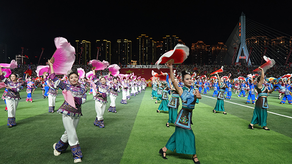 當日19時,活動在苗族歌手摩山人演唱的《貴州我深愛的家鄉》和《相信自己》歌曲中拉開活動序幕,隨後在“極速風暴”機車表演中震撼開場。轟鳴的引擎聲刺破夜空,鋼鐵巨獸列隊疾馳,炫酷的姿態瞬間點燃全場氛圍。國家級非物質文化遺産思南花燈驚艷登場,數千名錶演者身着絢麗民族服飾,手持花扇翩翩起舞,婉轉唱腔與靈動舞姿相映成趣,將“千年流光”的非遺韻味娓娓道來。
