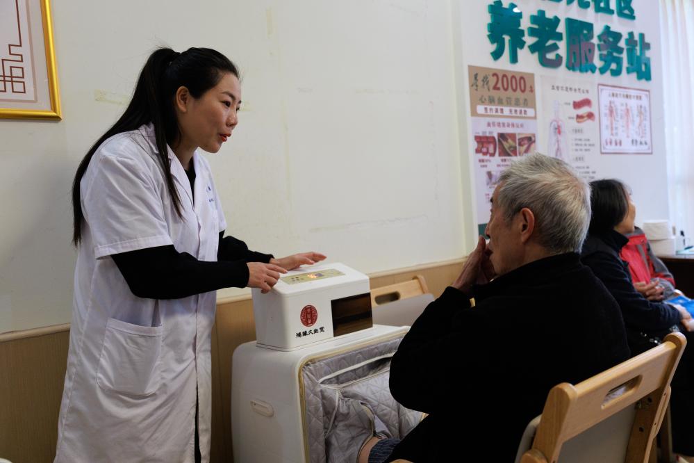 10月28日,在貴州省貴陽市觀山湖區世紀城街道景怡苑社區養老服務站,醫護人員給老年人提供推拿服務。