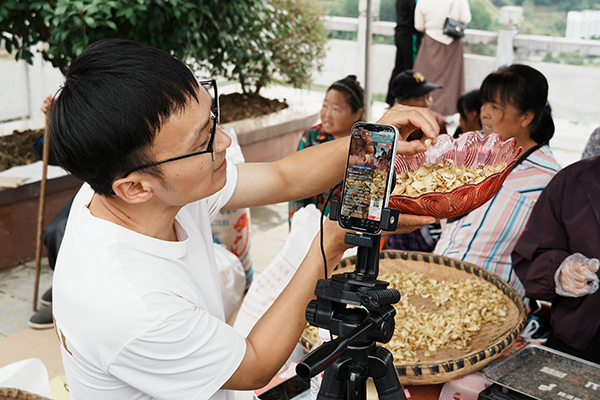 直播間外,農家花生、苦丁茶、黃豆、大米、當歸等各類農産品琳瑯滿目,群眾也按序排隊,滿懷期待地等待着銷售。78歲的葉朝明老人小心翼翼地解開口袋,露出裏面金燦燦的幹花生:“這些都是我親手種的,往年要背到鎮上賣,還不一定能賣出去,現在好了,通過直播能賣個好價錢,並且一次性可以幫我銷售完200斤!”他佈滿皺紋的手輕輕剝着花生,向工作人員展示着成色。