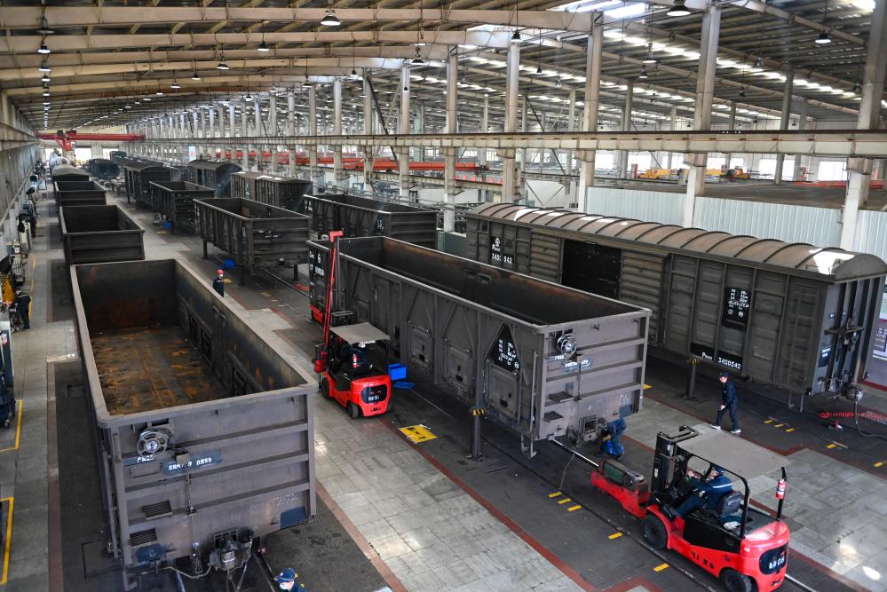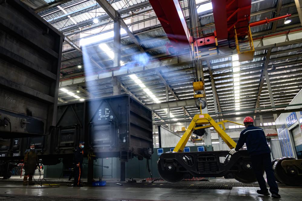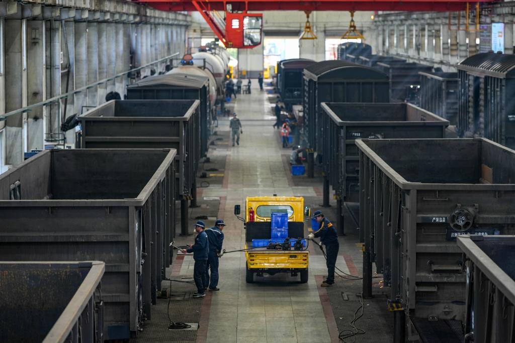 2月18日,在貴陽南車輛段檢修車間,工作人員對貨運列車車體進行檢修。