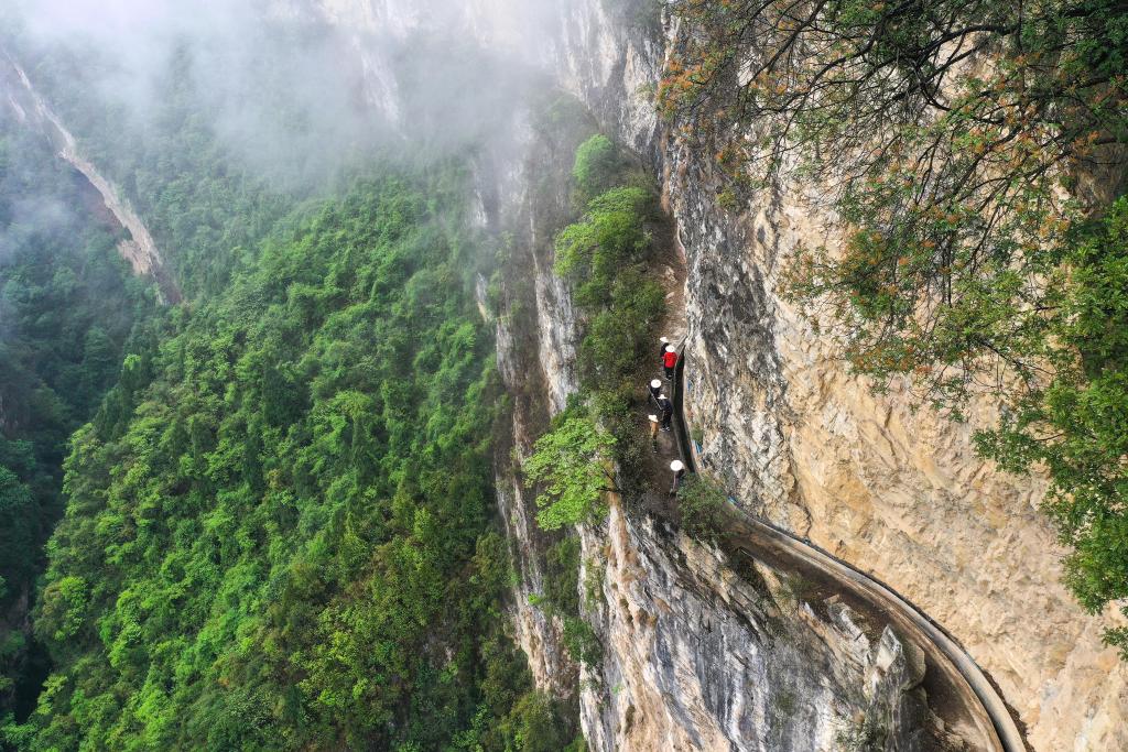 護渠隊員在畢節市七星關區生機鎮巡護高流天渠途中(2024年4月24日攝)。