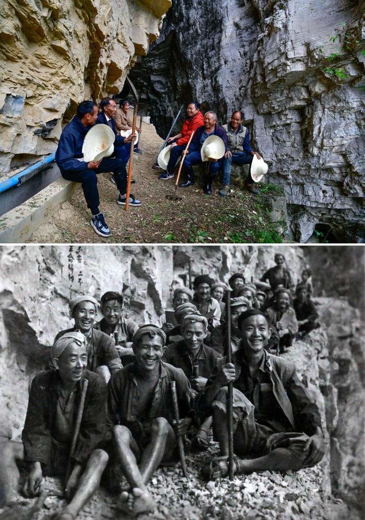 上圖為2024年4月24日,護渠隊員在畢節市七星關區生機鎮巡護高流天渠時留影;下圖為1960年,村民在七星關區生機鎮修鑿絕壁天渠時的合影。