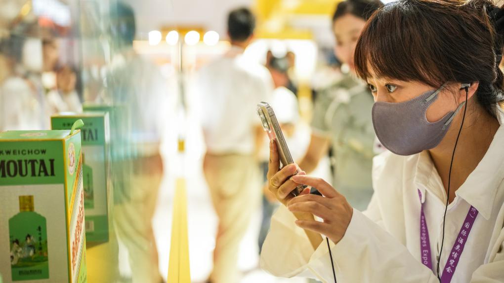 9月9日,一名網絡主播用手機直播酒博會展品。