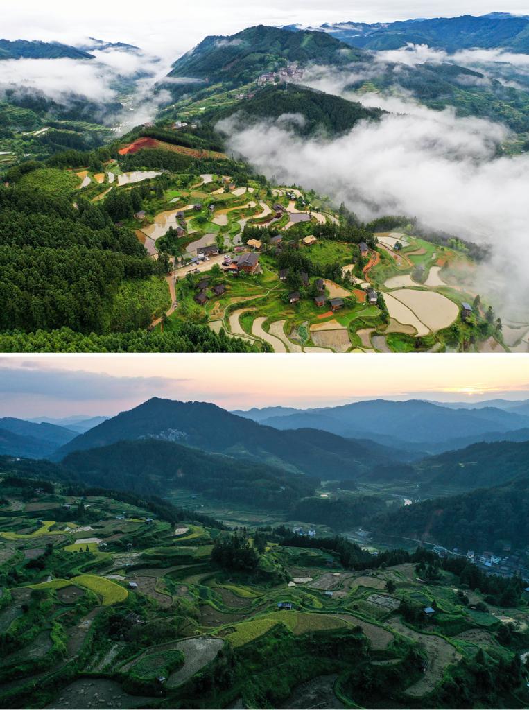 拼版照片:上圖為5月19日拍攝的貴州省黎平縣尚重鎮洋洞村春耕時節的梯田;下圖為9月18日拍攝的洋洞村秋收時節的梯田。