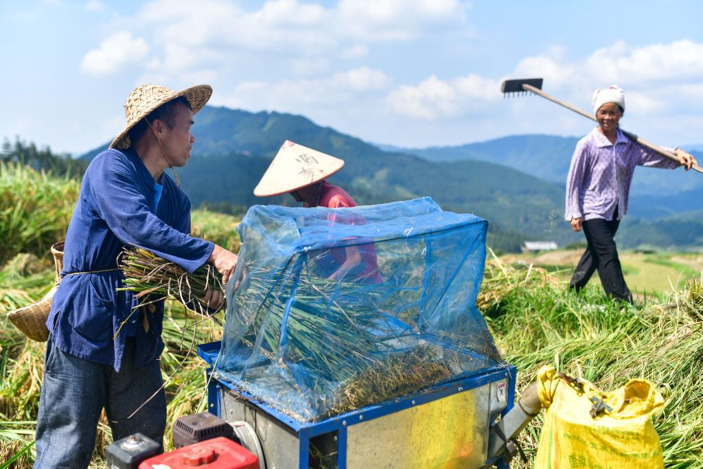 楊正熙(左)在貴州省黎平縣尚重鎮洋洞村的梯田上幫助村民晾曬稻穀(9月19日攝)。
