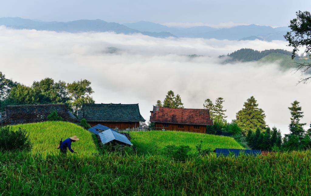 楊正熙在貴州省黎平縣尚重鎮洋洞村的梯田裏幫助村民收割水稻(9月19日攝)。