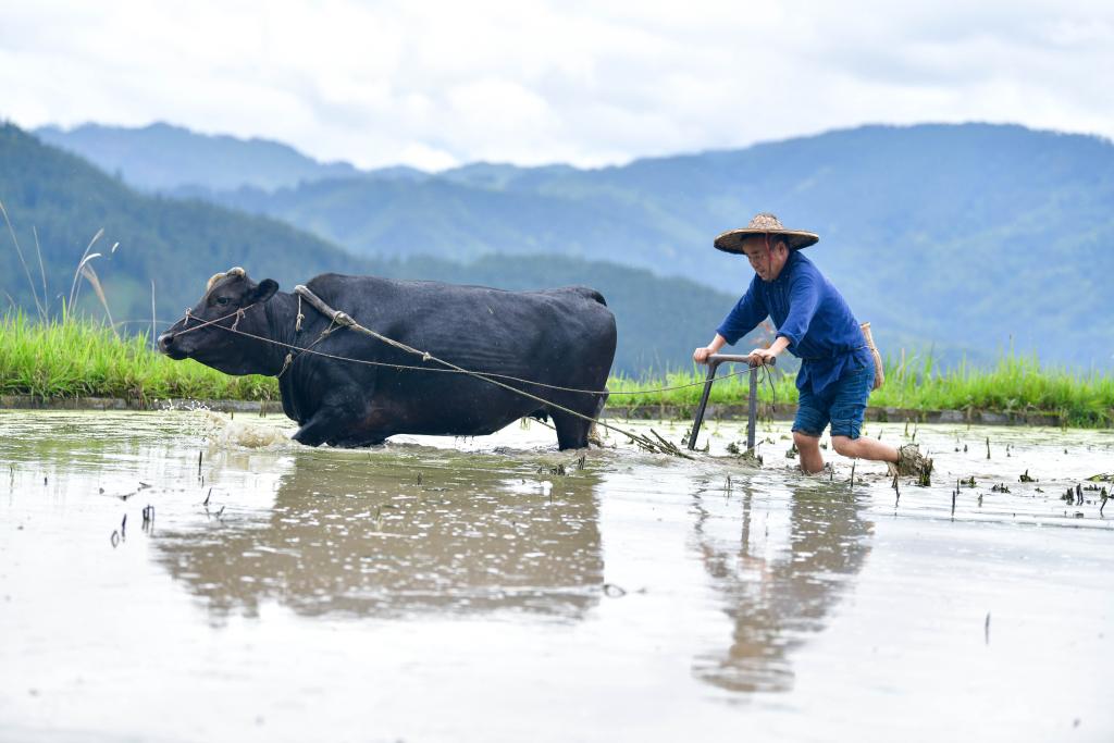楊正熙在貴州省黎平縣尚重鎮洋洞村的梯田上幫助村民耕田(5月19日攝)。