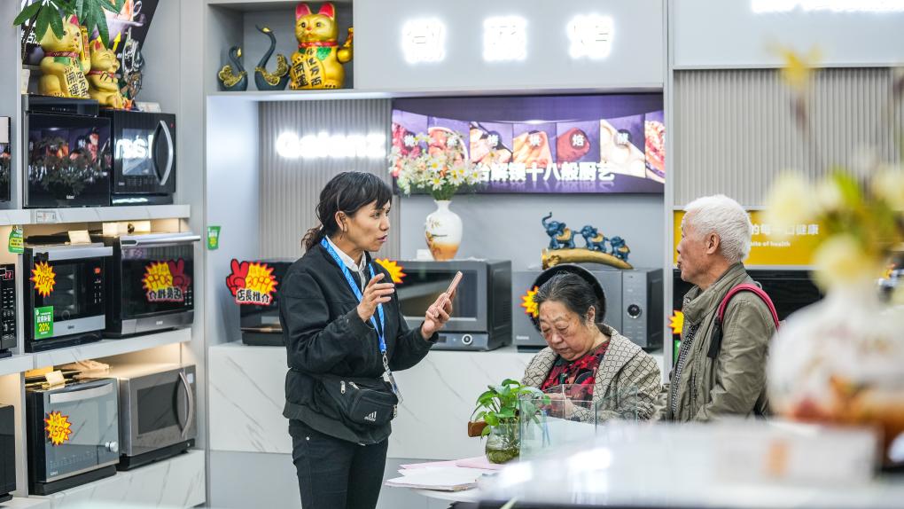 市民在貴陽市蘇寧易購噴水池店選購以舊換新商品(10月11日攝)。
