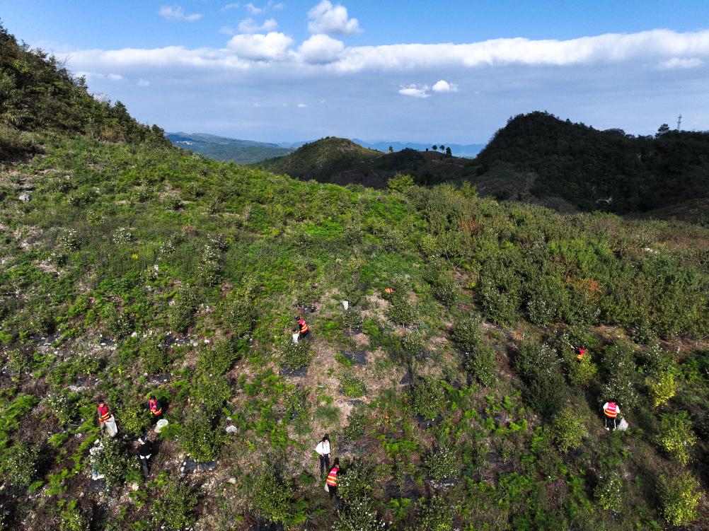 10月15日,村民在龍裏縣頤光山林油茶生態園採摘油茶果(無人機照片)。
