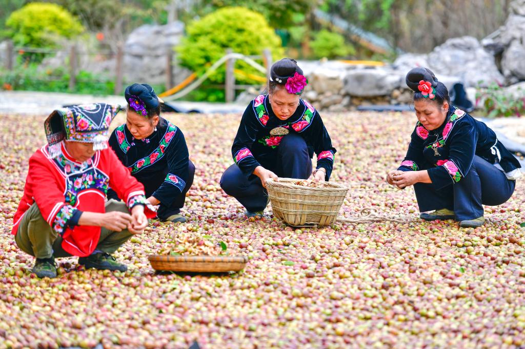 10月15日,村民在龍裏縣頤光山林油茶生態園晾曬油茶果。