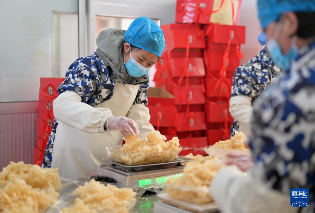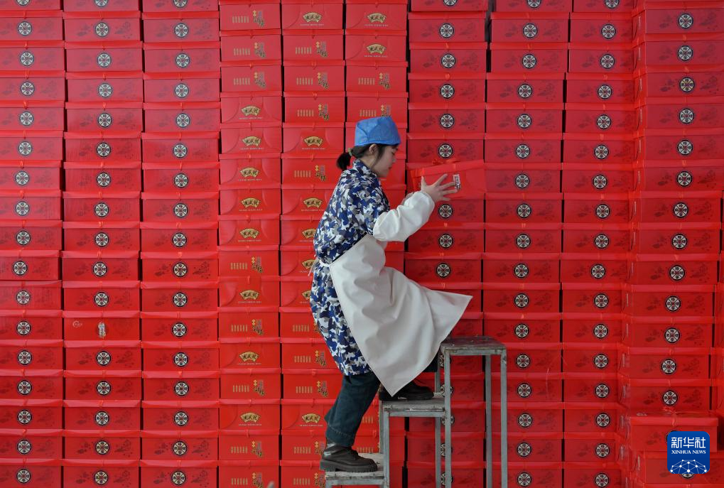 12月29日,工人在唐山市豐潤區一家傳統手工麻糖廠的成品車間工作。