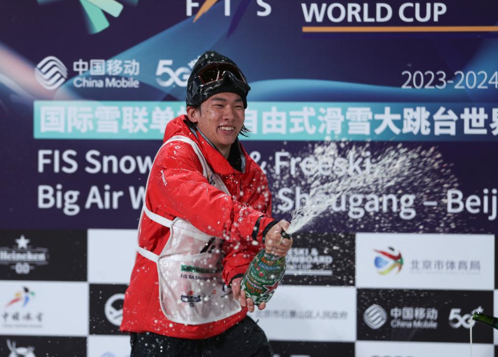 2023年12月2日,中國選手蘇翊鳴在頒獎儀式上慶祝。當日,在北京首鋼滑雪大跳&舉行的2023-2024賽季國際雪聯單板及自由式滑雪大跳&世界盃單板滑雪大跳&男子組決賽中,中國選手蘇翊鳴以184.50分奪得冠軍。新華社記者 許雅楠 攝