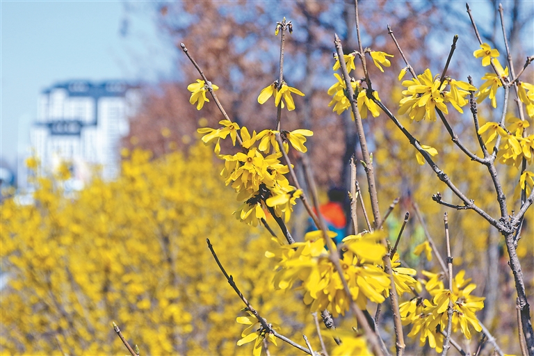金黃色的小花挂在枝頭隨風搖擺,洋溢着春天的氣息。在哈爾濱市香坊區三環路與三合路上,朵朵東北連翹綻放枝頭,格外醒目,吸引了一些市民前來打卡。