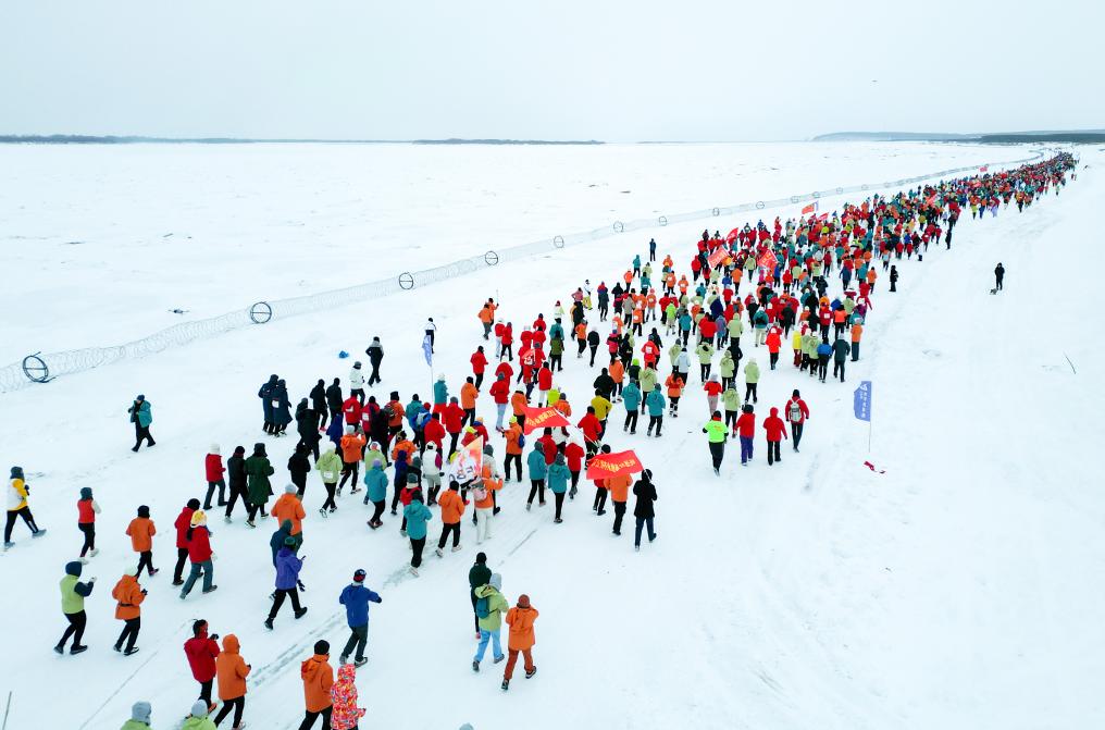 1月1日,參賽選手奔跑在冰封雪覆的黑龍江江面上(無人機照片)。新華社發(李擁軍攝)
