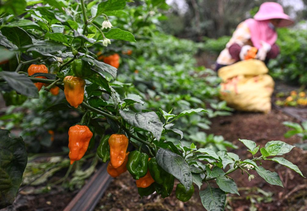 2月26日,村民在海南省海口市龍華區遵譚鎮龍合村采收黃燈籠辣椒。新華社記者 蒲曉旭 攝