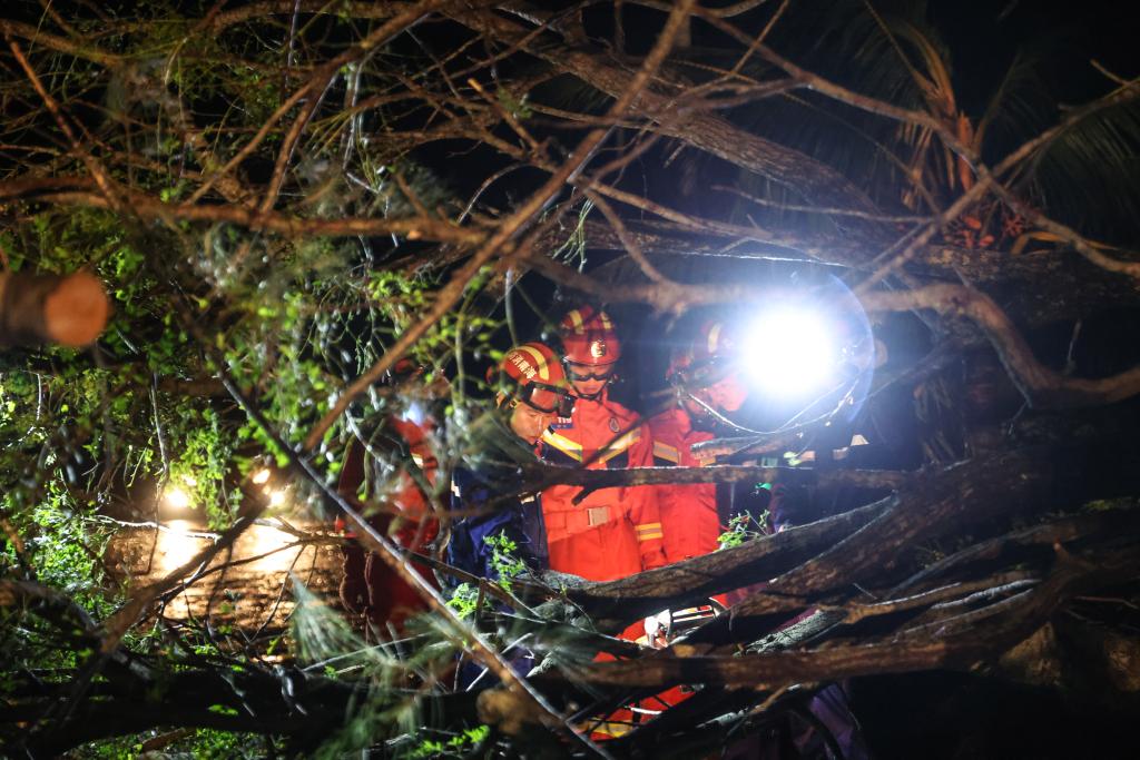 9月7日,在海南文昌市鋪前鎮,海南消防等應急部門在颱風過後的深夜清理路障。新華社記者 張麗蕓 攝