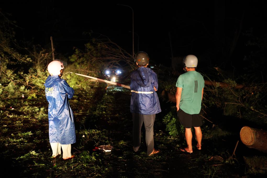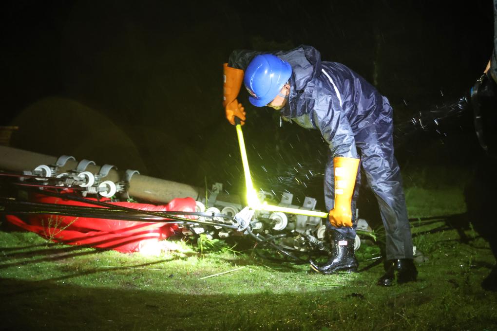 9月6日,在海南文昌市鋪前鎮,南方電網工作人員在颱風過後的深夜清理路障。新華社記者 張麗蕓 攝