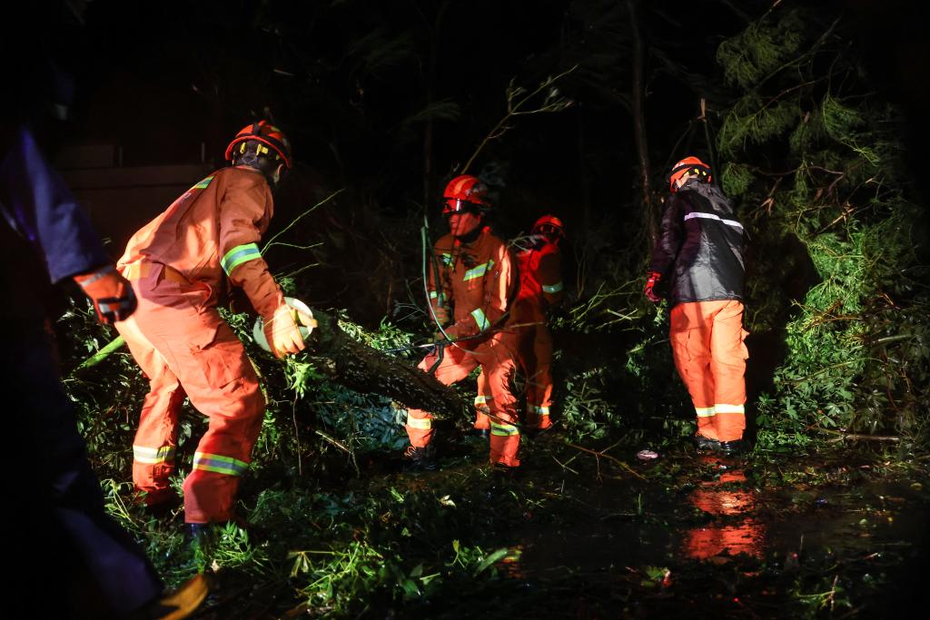 9月6日,在海南文昌市鋪前鎮,海南消防等應急部門在颱風過後的深夜清理路障。新華社記者 張麗蕓 攝