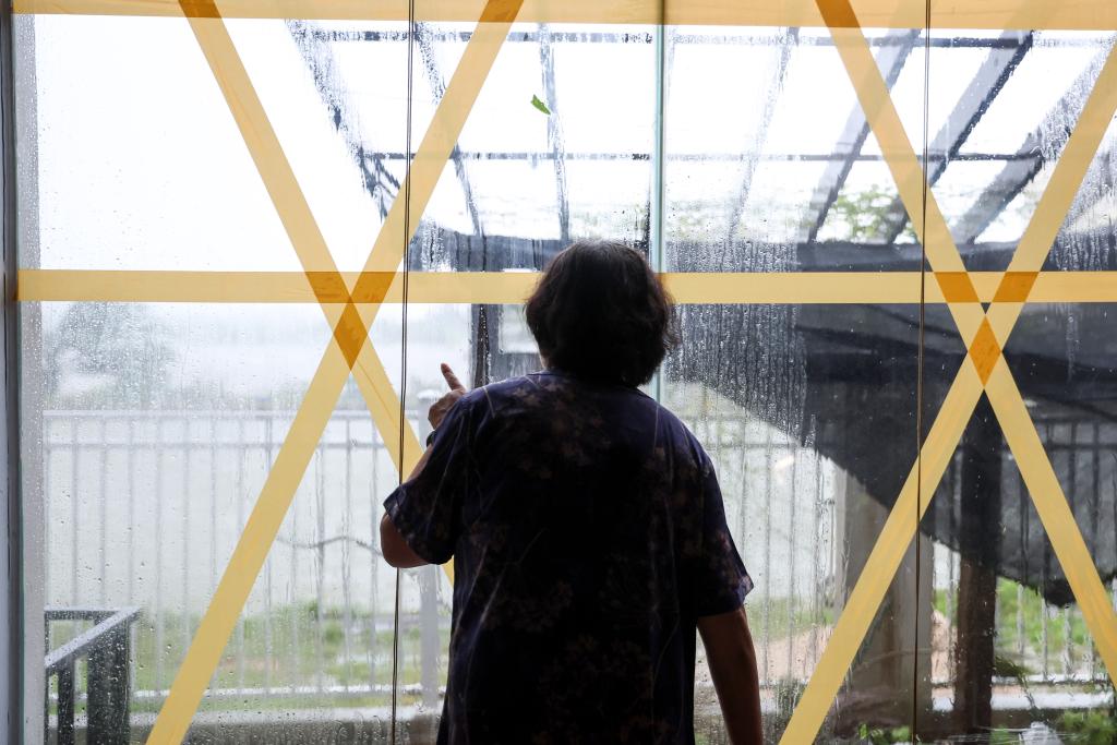 9月6日,在海南文昌市鋪前鎮,一家民宿店主在颱風登陸時望著窗外。新華社記者 張麗蕓 攝