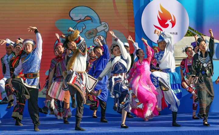 11月17日,身着各民族服飾的演員在火炬傳遞起跑儀式上表演。新華社記者 陳朔 攝
