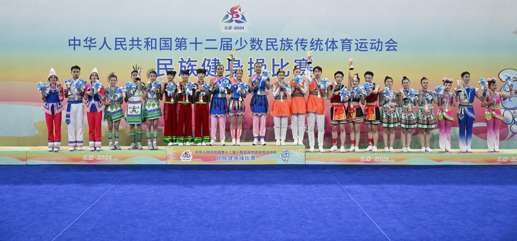 11月28日,運動員在頒獎儀式上隨音樂共跳一支舞。當日,在西南大學三亞中學體育館舉行的第十二屆全國少數民族傳統體育運動會民族健身操項目比賽全部結束。新華社記者 孫凡越 攝