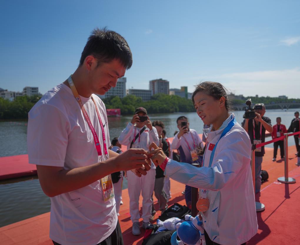 11月28日,何國潤(右)的男朋友向她求婚。當日,在海南省三亞市舉行的第十二屆全國少數民族傳統體育運動會獨竹漂女子組200米直道賽頒獎儀式後,海南隊選手何國潤的男朋友在頒獎儀式現場向她求婚,上演溫情一幕。新華社發(杜笑微攝)