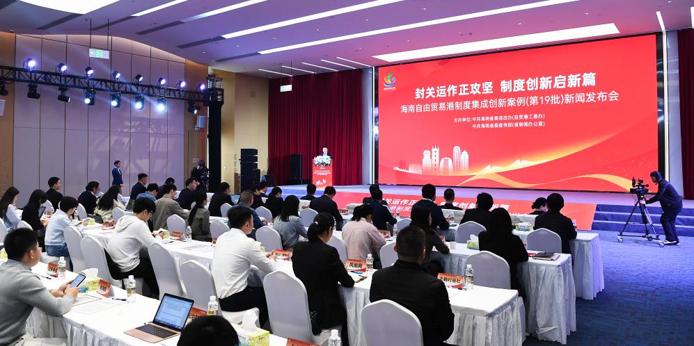 這是2月19日拍攝的海南自由貿易港製度集成創新案例(第19批)新聞發布會現場。當日,海南自由貿易港製度集成創新案例(第19批)新聞發布會在海口舉行,加工增值內銷免關稅政策從“試驗點”到“試驗田”等6項案例入選這批案例。新華社記者 楊冠宇 攝