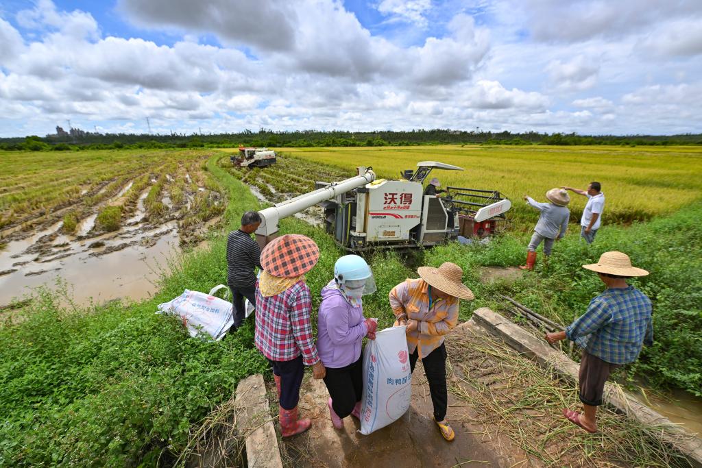 5月15日,農民將收割好的稻穀裝袋。進入5月,位於海口市琼山區雲龍鎮三十六曲溪兩岸的早稻進入夏收時節。當地農民趁着晴好天氣,忙着收割、晾曬稻穀。新華社記者 郭程 攝
