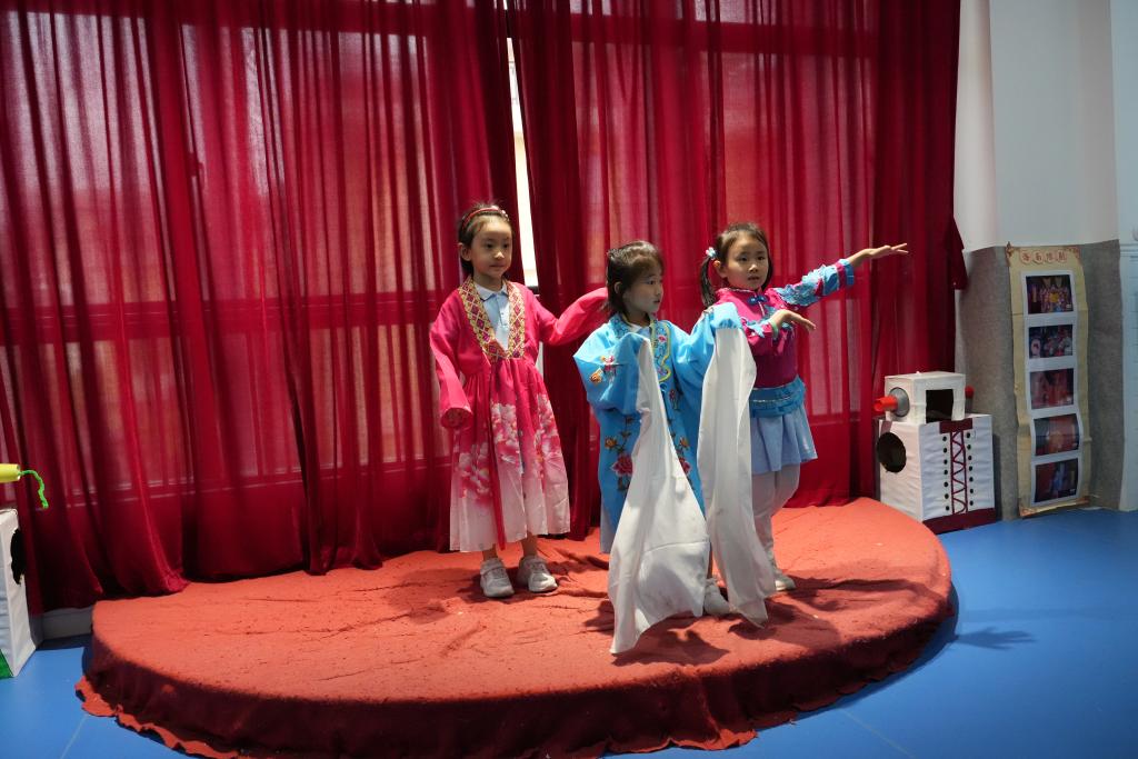 在海口市教育幼兒園“騎樓老街”微縮景觀游戲區,幼兒們正在戲&上模仿表演琼劇。新華社記者 夏天 攝