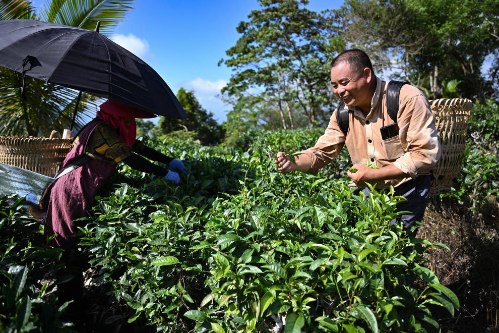 6月8日,工人在位於海南五指山市與保亭黎族苗族自治縣交界處的海南農墾金鼎茶園採茶。新華社記者 郭程 攝