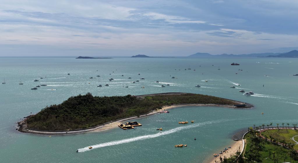 8月27日,游客在海南省三亞市乘坐游艇出海游玩(無人機照片)。新華社記者 趙穎全 攝