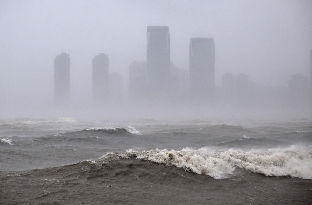 10月5日,受颱風影響,海口市海岸邊掀起大浪。新華社記者 郭程 攝