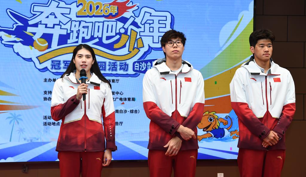 當日,以“泳往直前,共築夢想”為主題的游泳奧運冠軍進校園活動在海南省白沙黎族自治縣舉行。奧運冠軍張雨霏、覃海洋、潘展樂來到海南中學白沙學校,與師生進行互動交流、分享經驗。