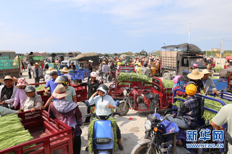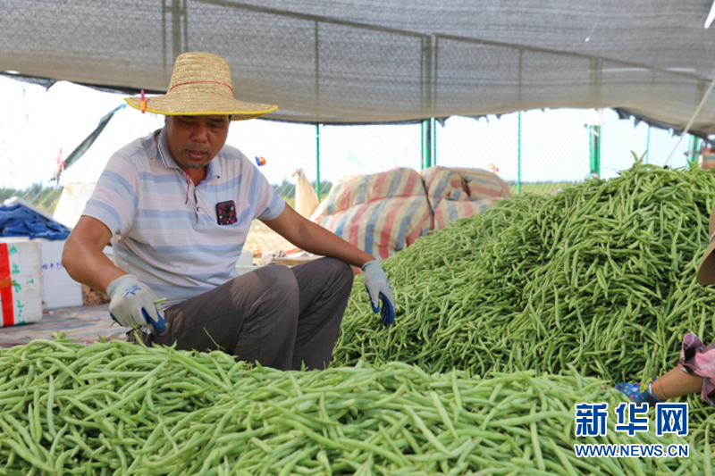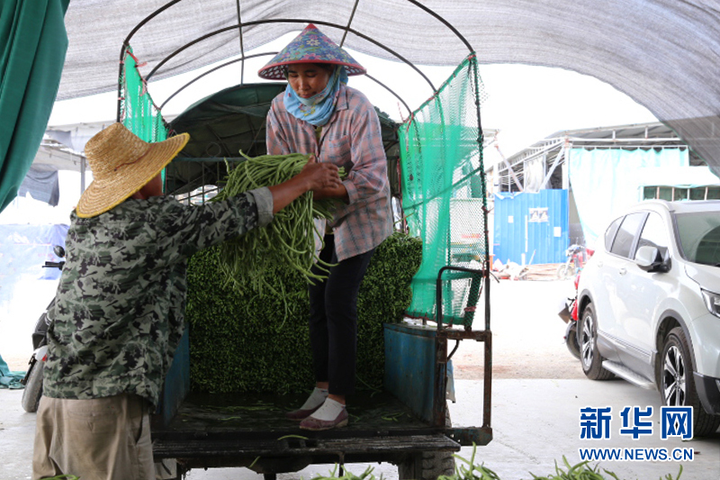 2月15日,崖州區種植戶(左)憑藉品相較好的豇豆吸引多家採購商前來議價。新華網 王雯君 攝