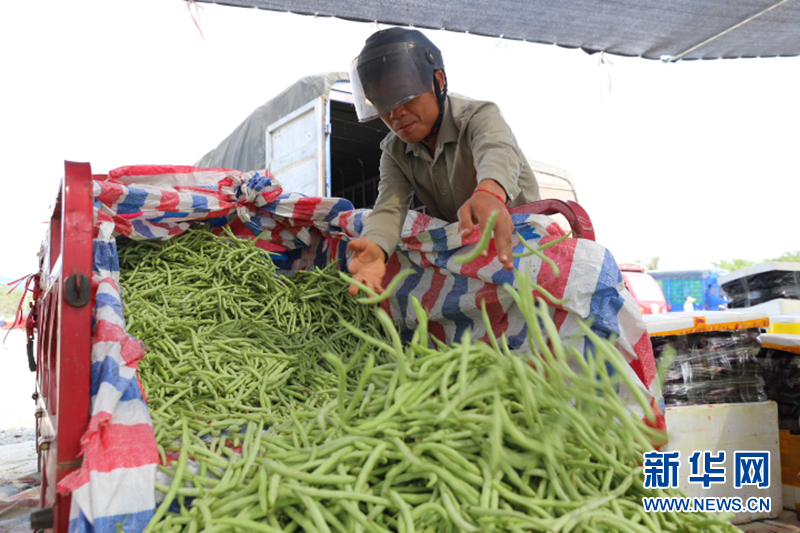 2月15日,種植戶在檔口處卸下豇豆。新華網 王雯君 攝
