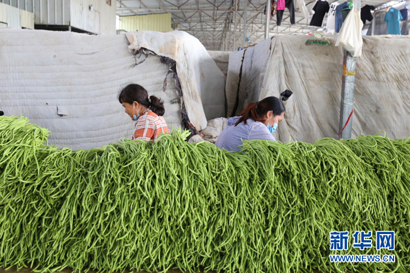 2月15日,工人在批發市場檔口內對豇豆進行分揀。新華網 王雯君 攝
