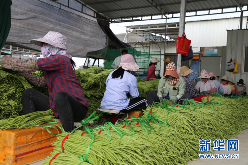 2月15日,工人在批發市場檔口內對豇豆進行分揀、捆紮。新華網 王雯君 攝