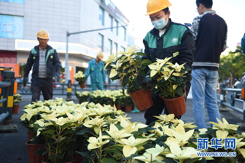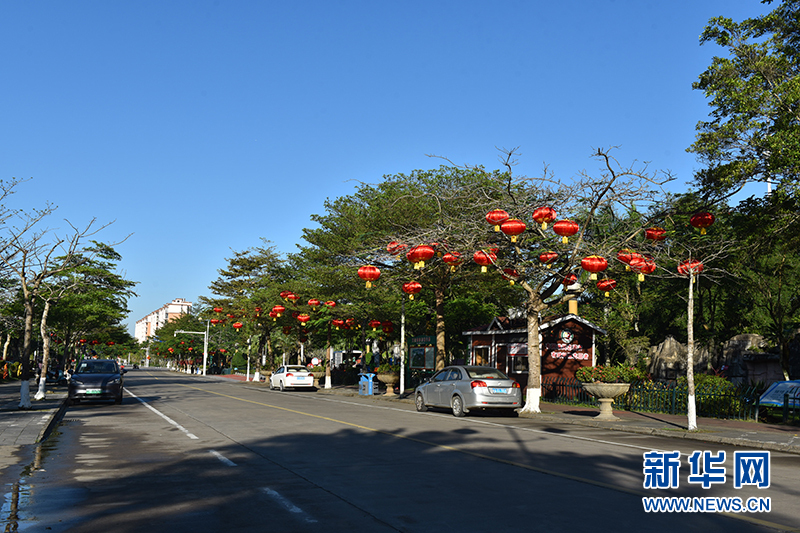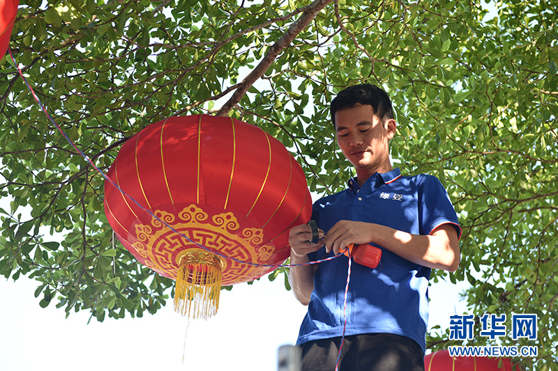 春節臨近,海南省屯昌縣開展懸挂燈籠、擺放花卉等工作,營造歡樂祥和的節日氣氛。