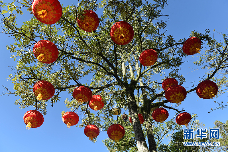 街道旁的綠色灌木上懸挂起火紅的燈籠。新華網發