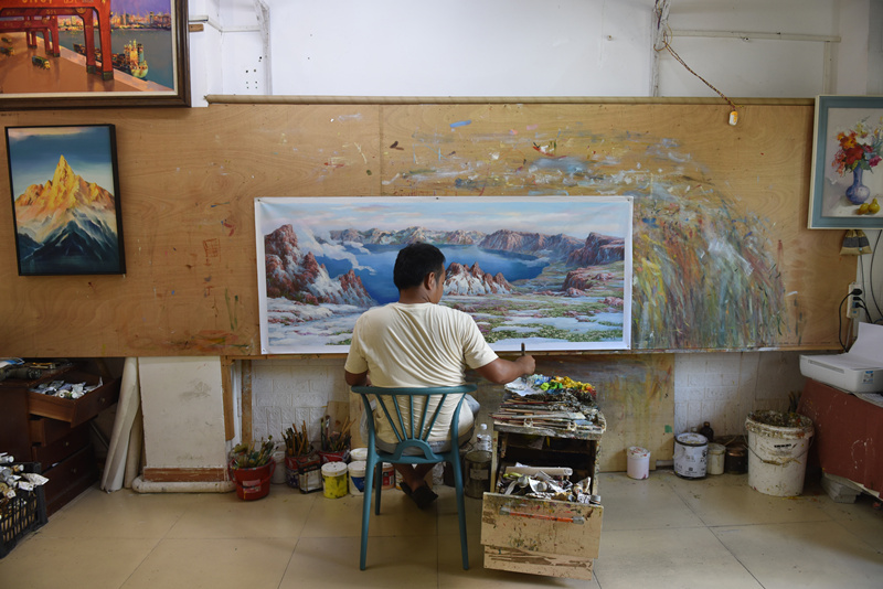“我們這裡最年輕的一批畫師,都在30歲左右。”7月25日,海南省屯昌縣油畫産業協會會長陳益君在油畫街接受採訪時説道。