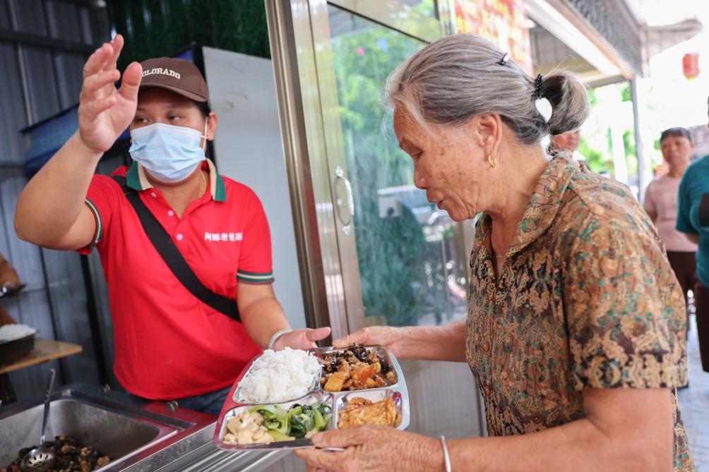 6月17日,海南省東方市新龍鎮龍臥村的老人在村裏的“幸福餐桌”領取午餐。